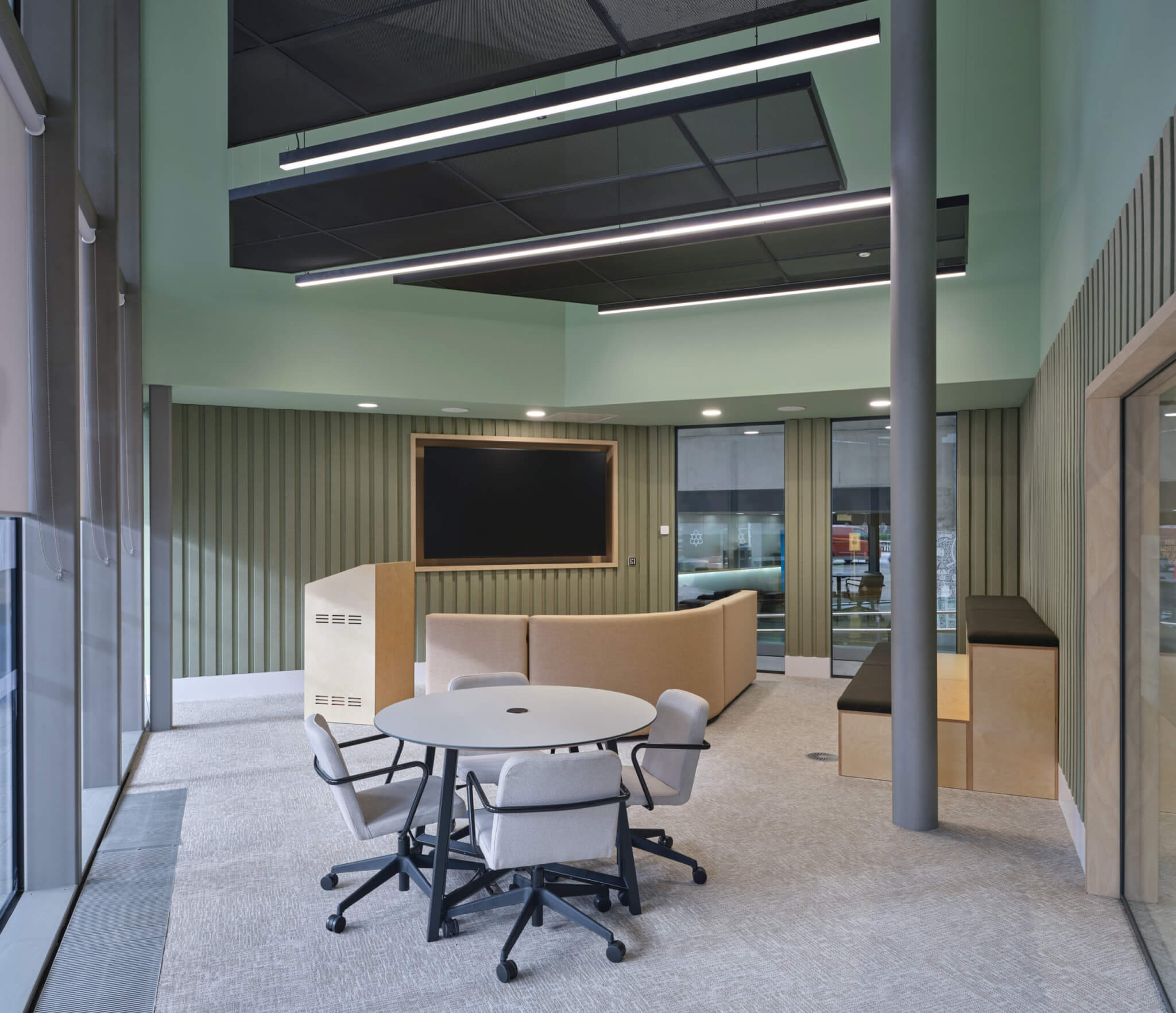 The 8-metre double-height room created interesting design considerations, particularly around lighting and environmental control. We developed solutions that worked with the building’s existing infrastructure whilst meeting the specific needs of the new careers hub.