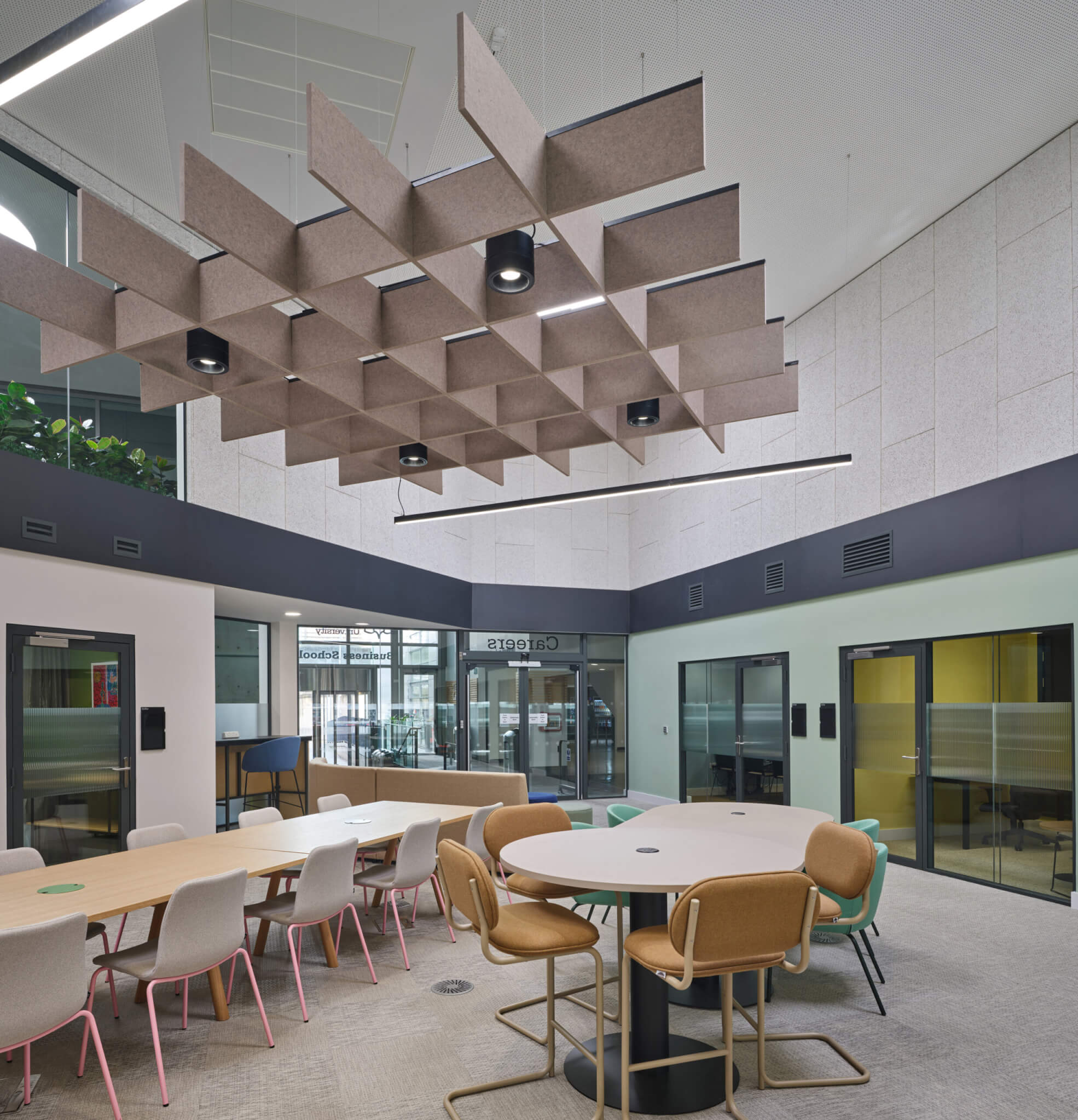 The university now has a functional careers hub that makes excellent use of previously underutilised space. Students have access to both private meeting areas for individual career guidance and a central space for industry presentations. The careful integration of building services ensures the space is comfortable and well-lit despite the challenges of the double-height room. The project demonstrates how thoughtful engineering can breathe new life into existing spaces, creating valuable facilities without the need for new construction.